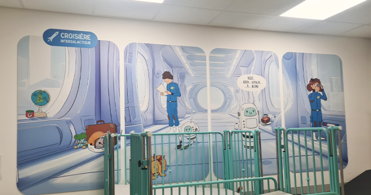 De la salle d’attente jusqu’à la salle d’IRM, tout le parcours a été décoré : les murs, les sols, le plafond... Chaque recoin transporte les enfants dans une mission intergalactique, les éloignant du stress et de l’inconnu.