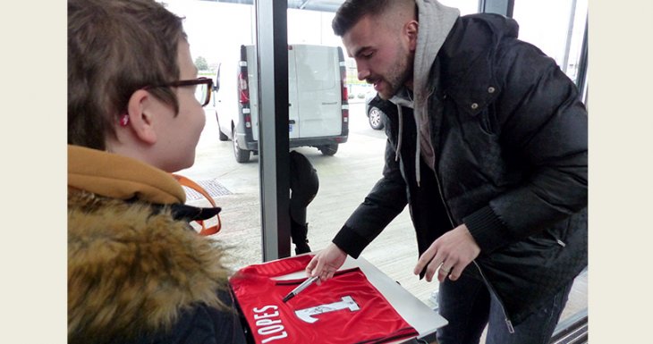 Alek a ensuite accès aux vestiaires de l’équipe, où l’attend Anthony Lopez, son joueur préféré ! Blessé, il n’avait pas pu participer à l’entraînement. Ils discutent et le professionnel signe le maillot de notre prince.