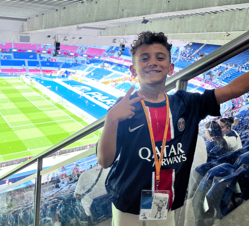 Installé en tribune, Hédi assiste au match PSG – Angers. Le début est calme, mais l'explosion de joie est immense lorsque le PSG marque l'unique but de la rencontre. Le sourire de Hédi illumine la soirée !