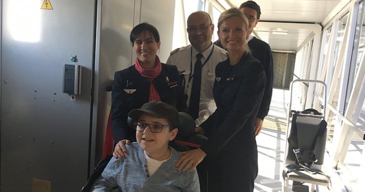 Pour ce premier voyage en avion vers le Danemark, Jonas est traité en VIP par le personnel de la compagnie aérienne : visite de la cabine de pilotage à l’arrivée, photos avec tout l’équipage, sans oublier la remise de son diplôme de vol.
