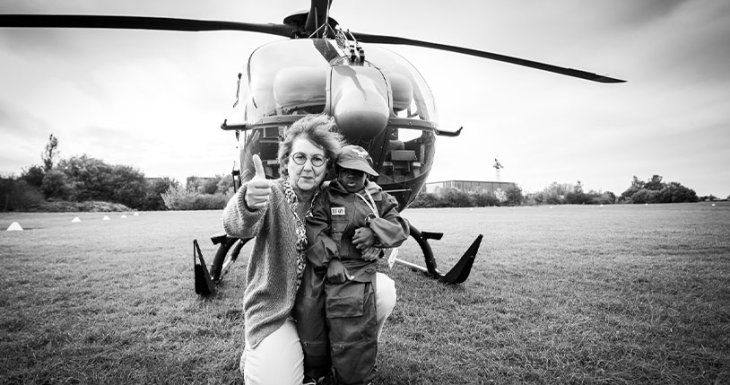 Rayan ouvre de grands yeux lorsqu’il découvre tous les hélicoptères au sol. Le pilote vient chercher les passagers et les installe. Exceptionnellement, Rayan est autorisé à s’assoir à l’avant, assis à côté du pilote, il est très fier !! Il met son casque et c’est parti : l’engin décolle pour survoler Paris et ses environs avant d’atterrir à Satory près de Versailles.